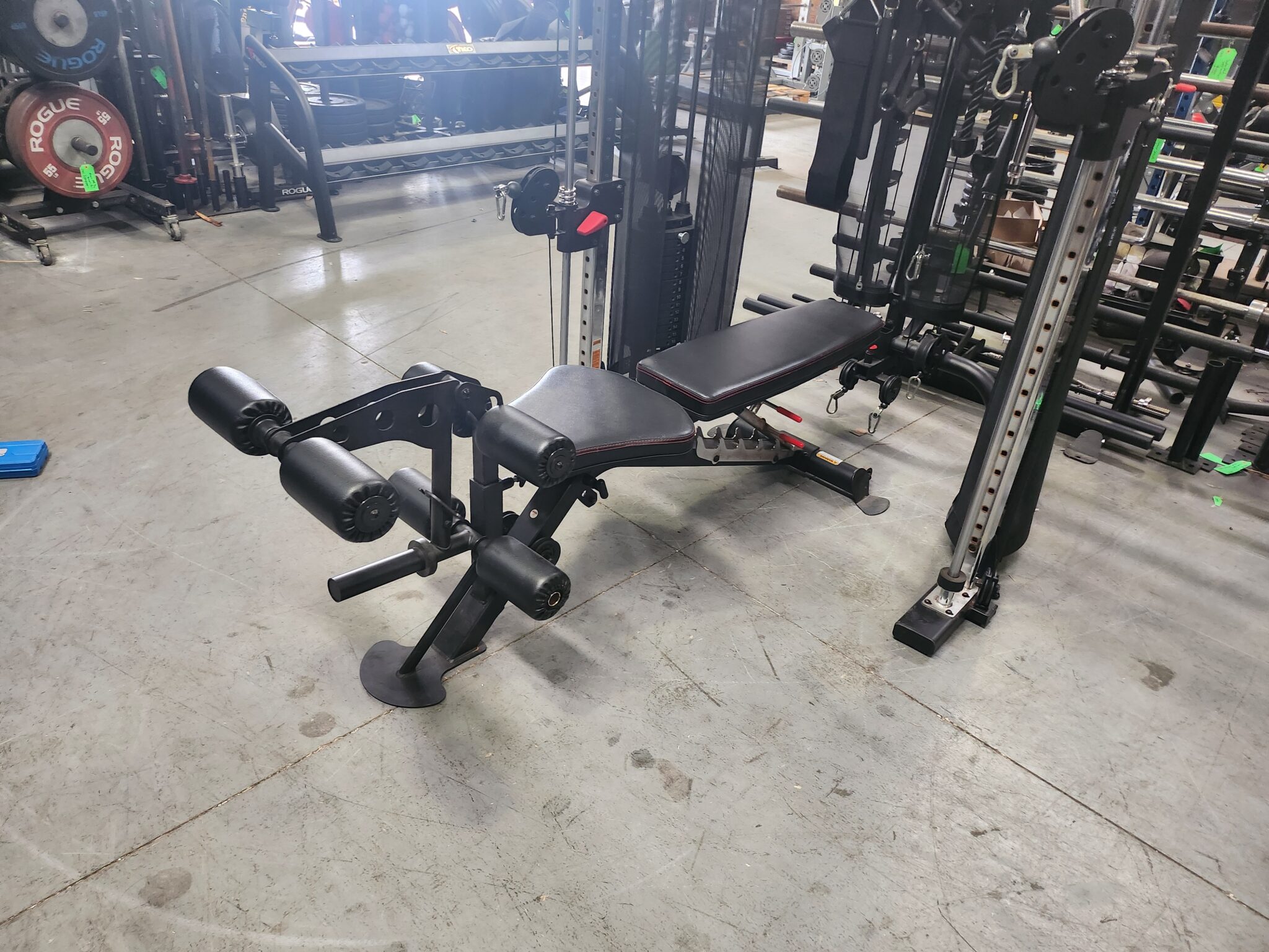 Adjustable Bench connects to weight stacks for leg extension and leg curl.